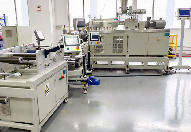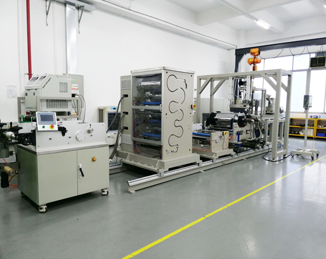 采用熱緻相分離(TIPS)法工藝的锂電隔膜成套實驗與試産設備,實現了高分子材料的混煉擠出、流延成型、雙向拉伸、萃取定型、二級拉伸自動收卷等锂電隔膜生産制備的整個流程。